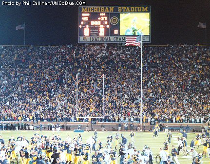 First, Michigan cut the lead to two touchdowns with a field goal by Garrett Rivas. Then, Brian Thompson recovered the insides kick after it bounced off a Michigan State player, and Michigan was in business. Two plays later, Edwards went up and grabbed a jump ball away from the cornerback in the end zone to bring Michigan to within one touchdown. Suddenly, a palpable shift had occurred. With 3:05 left in regulation, Mike Hart bounced outside a would-be tackle and gained 26 yards to the Spartan’s 22 yard line, and Michigan Stadium was shaking. On the ensuing play, Edwards out-jumped a defender again, and the score was tied, 27-27. However, Michigan State didn’t panic, and with time for one play in regulation, the Spartans had a shot at a 52-yard field goal, but Dave Rayner’s kick was short, and the game went to overtime.