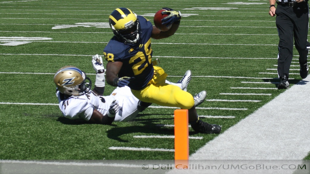 Gardner and Gallon had more than a little help from their friends. Fitz Toussaint ran well producing 131-yards and four TDs. He is only the sixth M running back to nail four rushing TDs in a game. A solid improvement from last week, when Fitz had 27 carries for a one-yard net average per attempt.